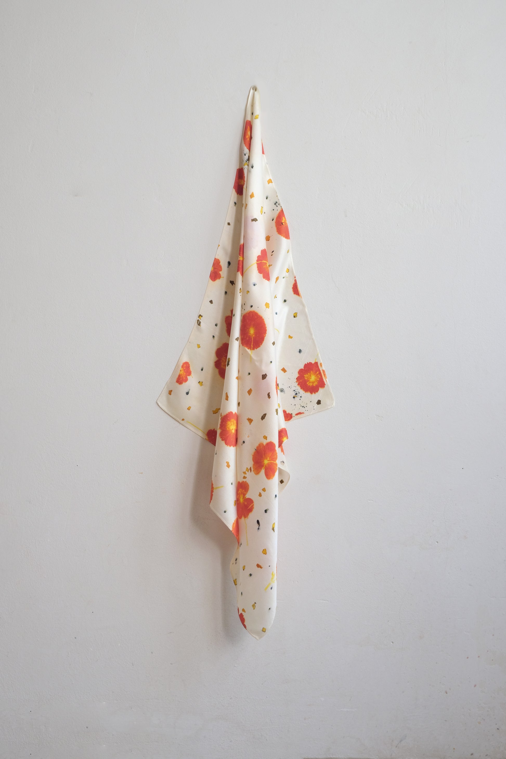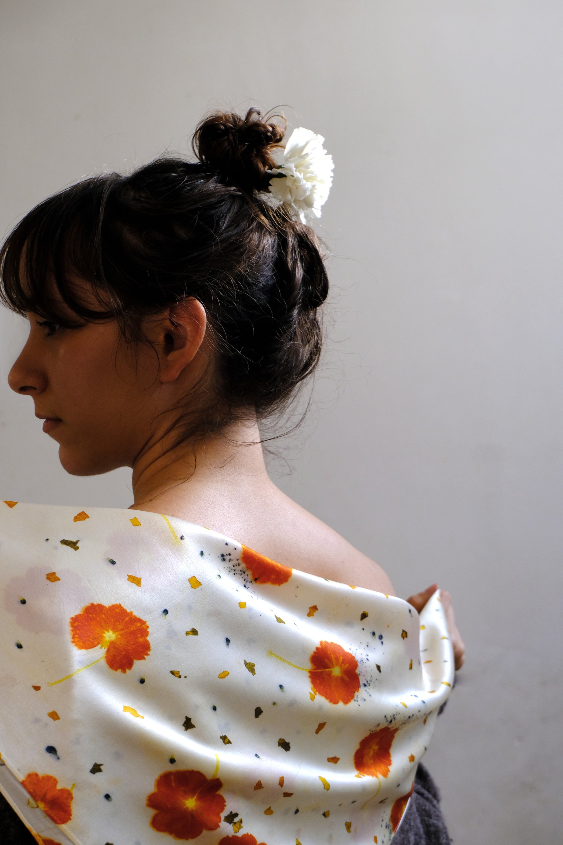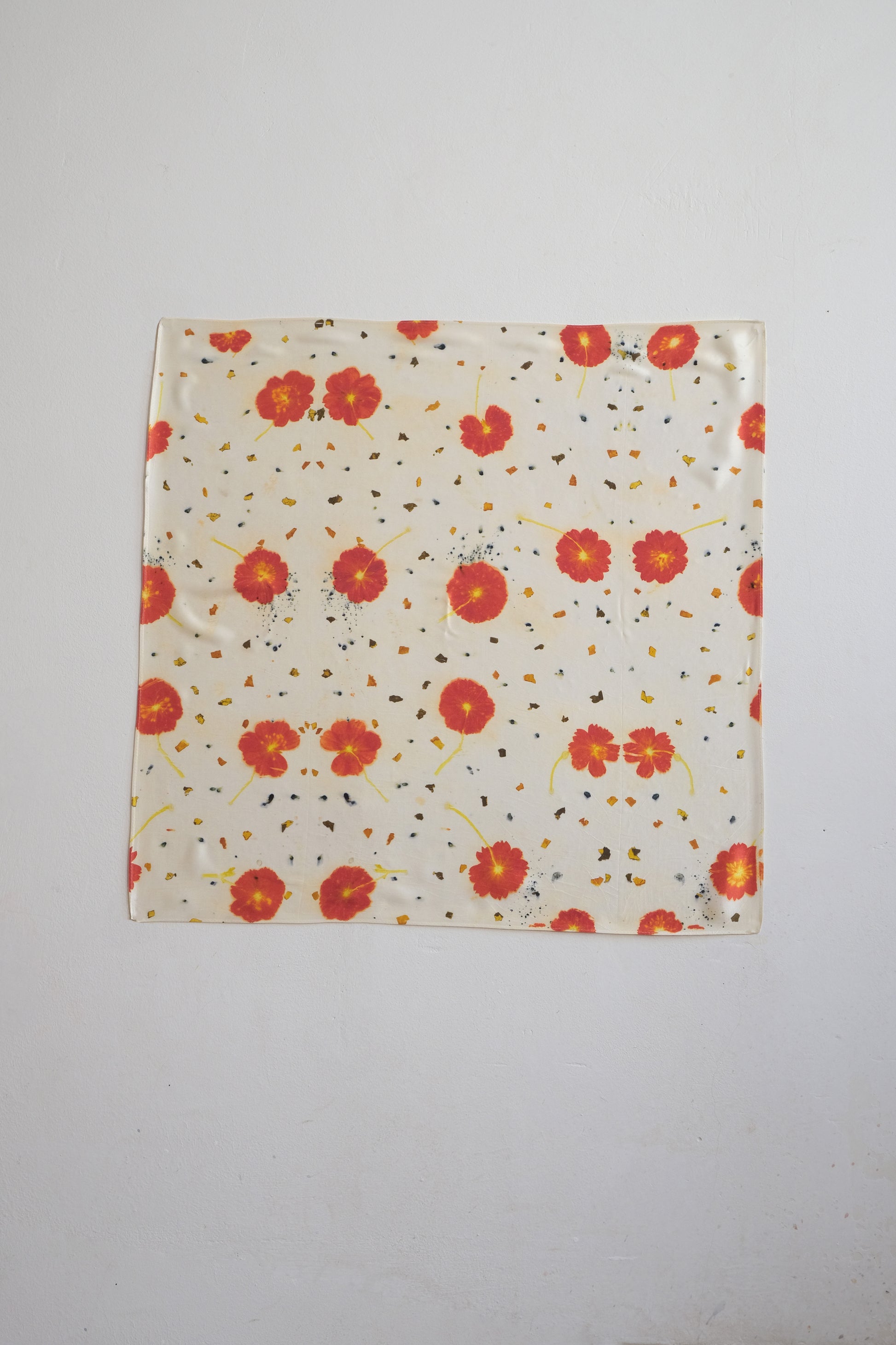 Pañuelo de seda estampado artesanalmente con flores, pétalos y algunos de nuestros elementos botánicos favoritos.