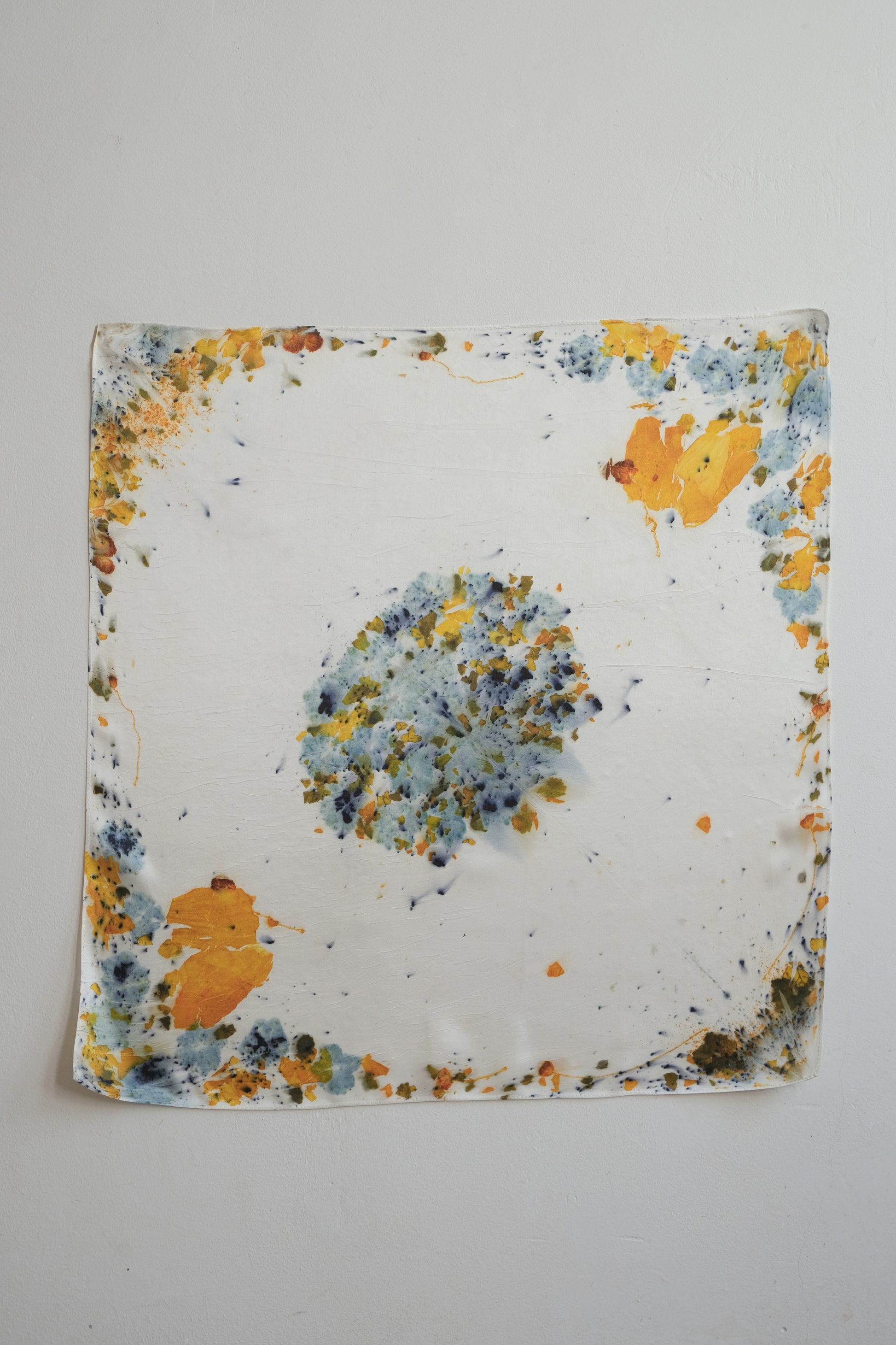 Pañuelo de seda estampado artesanalmente con flores, pétalos y algunos de nuestros elementos botánicos favoritos.