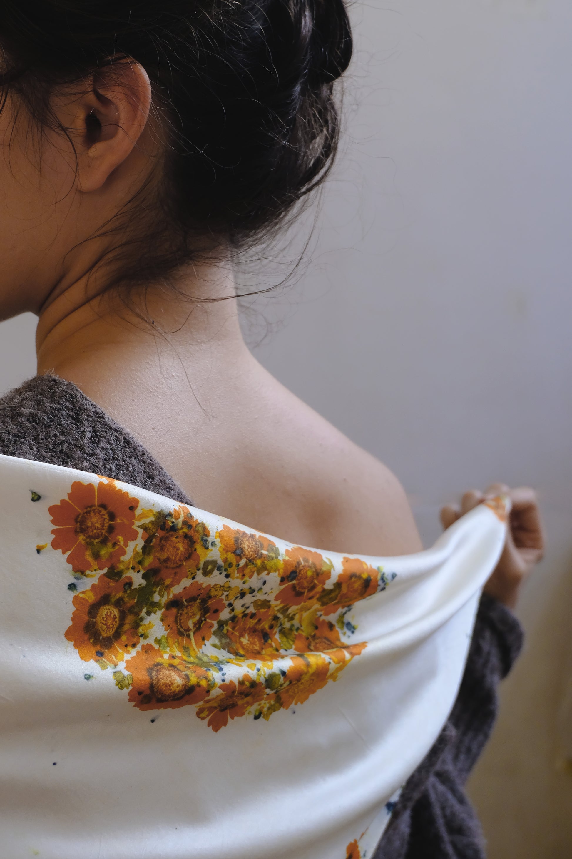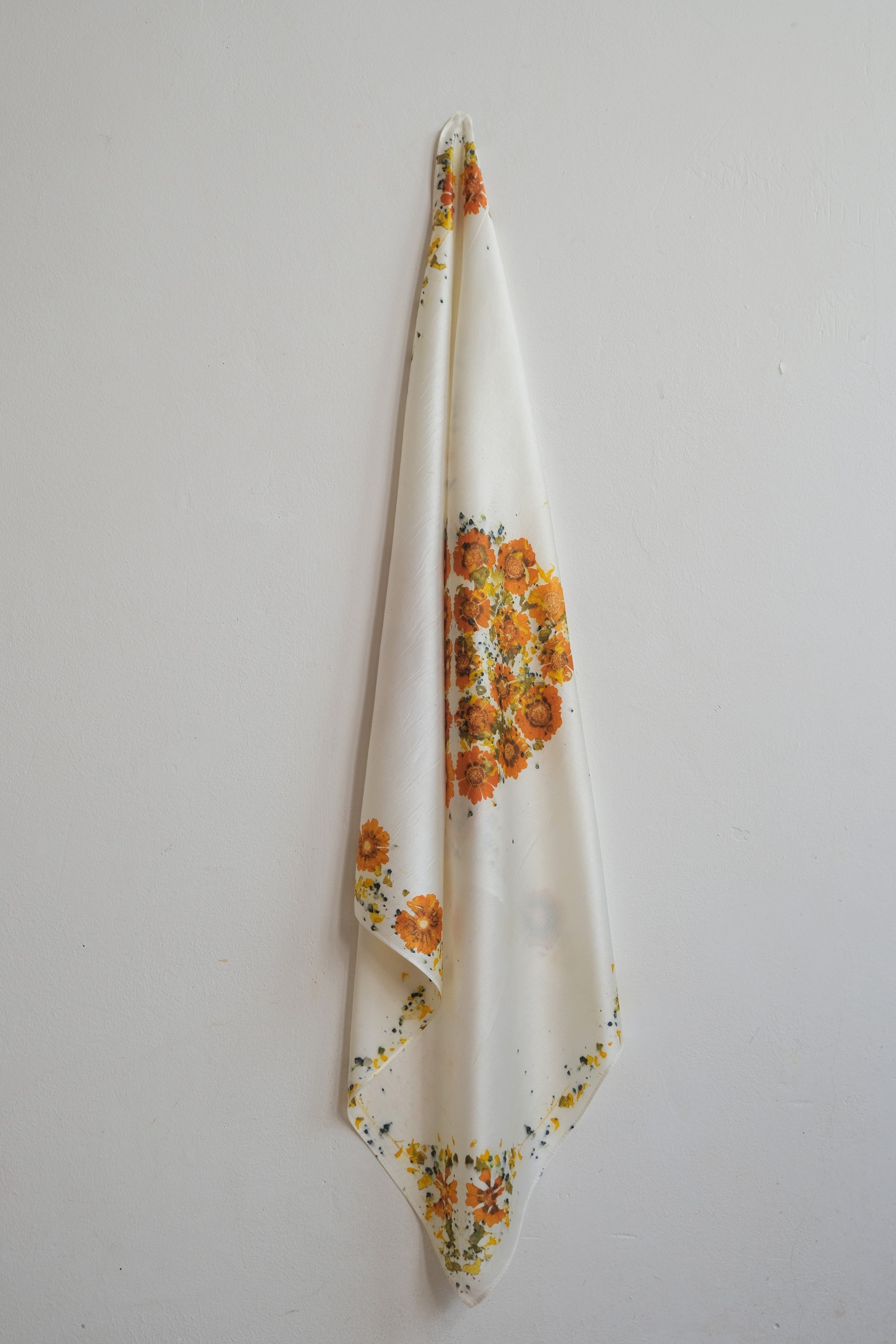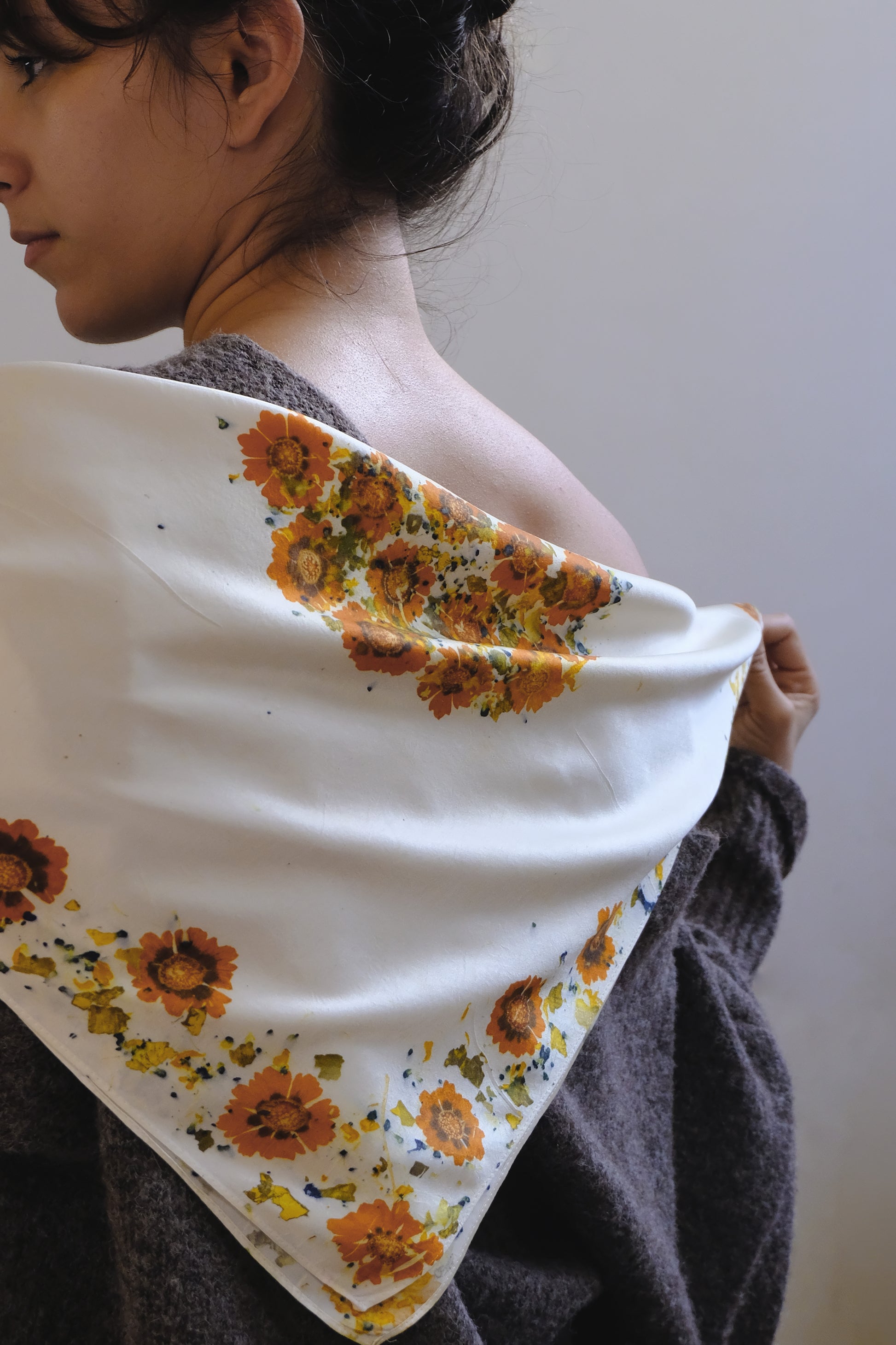 Pañuelo de seda estampado artesanalmente con flores, pétalos y algunos de nuestros elementos botánicos favoritos.
